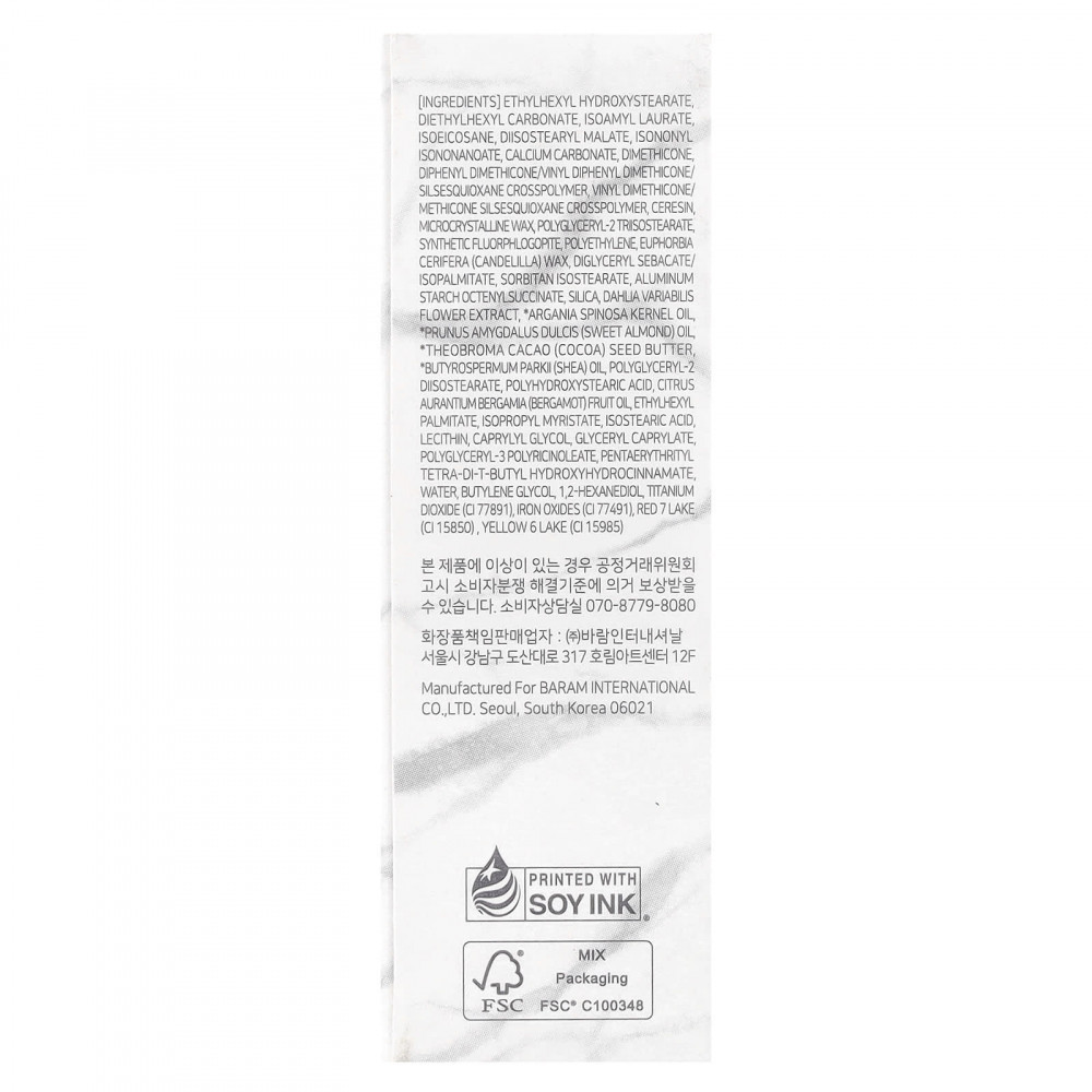 Этилгексил гидроксистеарат, диэтилгексилкарбонат, изоамил лаурат, изоэйкозан, диизостеарил малат, изононил изононаноат, карбонат кальция, диметикон, кроссполимер дифенил диметикон / винил дифенил диметикон силсесквиоксан, винилдиметикон / метикон силсесквиоксан кроссполимер, церезин, микрокристаллический воск, полиглицерил-2 триизостеарат, синтетический фторфлогопит, полиэтилен, канделильский воск (Euphorbia cerifera), диглицерил себацинат / изопальмитат, сорбитан изостеарат, алюминия крахмал октенилсукцинат, диоксид кремния, экстракт цветков георгина (Dahlia variabilis), масло из косточек аргании (Argania spinosa), масло сладкого миндаля (Prunus amygdalus dulcis), масло семян какао (theobroma cacao) * масло ши (Butyrospermum parkii), полиглицерил-2 диизостеарат, полигидроксистеариновая кислота, масло бергамота (Citrus aurantium bergamia), этилгексил пальмитат, изопропил миристат, изостеариновая кислота, лецитин, каприлилгликоль, глицерил каприлат, полиглицерил-3-полирицинолеат, пентаэритритил тетра-ди-трет-бутил гидроксигидроциннамат, вода, бутиленгликоль, 1,2-гександиол, диоксид титана (CI 77891), оксиды железа (CI 77491), краситель красный 7 лак (CI 15850) , краситель желтый 6 (CI 15985).