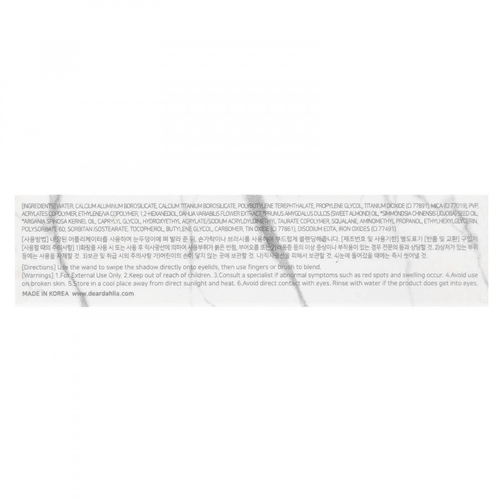 Вода, кальций алюминий боросиликат, боросиликат кальция и титана, полибутилентерефталат, пропиленгликоль, диоксид титана (CI 77891), слюда (CJ 77019), ПВП, сополимер акрилатов, этилен / ва-сополимер, 1,2-гександиол, экстракт цветков георгина (Dahlia variabilis), масло сладкого миндаля (Prunus amygdalus dulcis), масло семян жожоба (Simmondsia chinensis), масло из косточек аргании (Argania spinosa), каприлилгликоль, гидроксиэтил акрилат/натрия акрилоилдиметилтаурата сополимер, сквалан, аминометил пропанол, этилгексилглицерин, полисорбат 60, сорбитан изостеарат, токоферол, бутиленгликоль, карбомер, оксид олова (CI 77861), двунатриевая ЭДТК, оксиды железа (CI 77491).