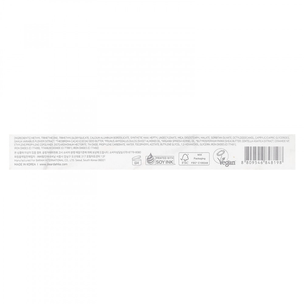 Метил триметикон, триметилсилоксисиликат, кальций алюминий боросиликат, синтетический воск, гептил ундециленат, слюда, диизостеарил малат, сорбитан оливат, октилдодеканол, каприловые / каприновые глицериды, экстракт цветков георгина (Dahlia variabilis), масло из семян какао (Theobroma), масло сладкого миндаля (Prunus amygdalus dulcis), масло из косточек аргании (Argania spinosa), масло ши (Butyrospermum parkii), экстракт готу колы (Centella asiatica), керамид NP, сополимер этилена/пропилена, дистеардимония гекторит, оксид олова, пропиленкарбонат, вода, токоферилацетат, бутиленгликоль, 1,2-гександиол, глицерин, оксиды железа (CI 77491), оксиды железа (CI 77499), диоксид титана (CI 77891), оксиды железа (CI 77492).