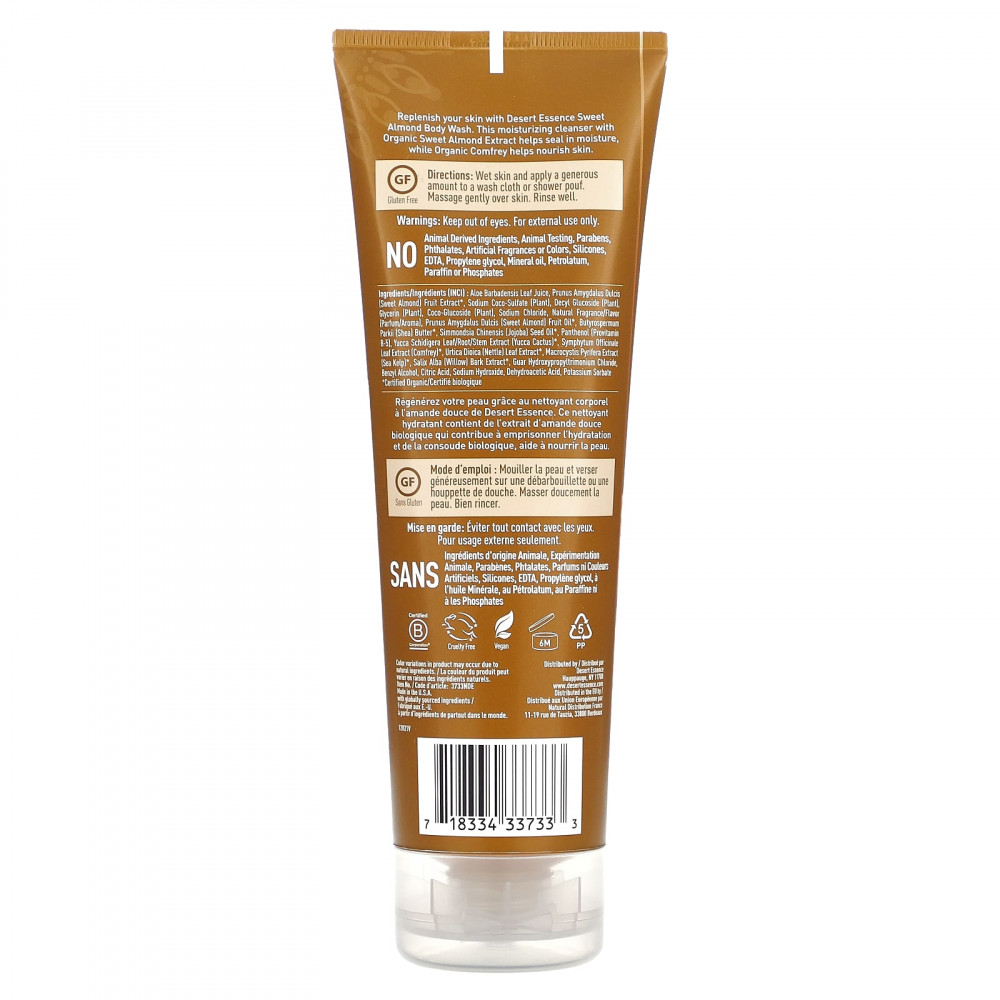 Наполните кожу гелем для душа со сладким миндалем от Desert Essence. Это увлажняющее очищающее средство с органическим экстрактом сладкого миндаля удерживает влагу, а органический окопник питает кожу.