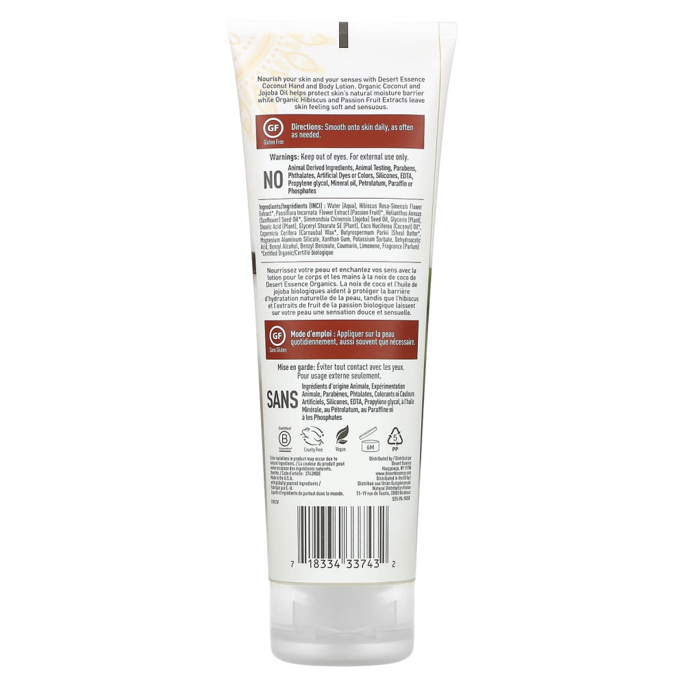Питайте свою кожу и свои чувства с помощью лосьона для рук и тела с кокосом Desert Essence. Органическое масло кокоса и жожоба помогает защитить естественный водный барьер кожи, а органические экстракты гибискуса и маракуйи делают кожу мягкой и чувственной.
