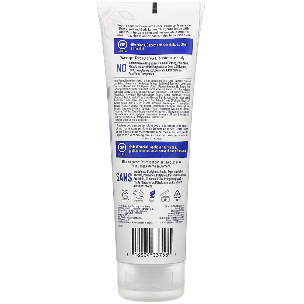 Успокойте чувствительную кожу с помощью лосьона для рук и тела без запаха Desert Essence. Этот нежный лосьон с алоэ вера успокаивает, а органический зеленый чай, богатый антиоксидантами, помогает питать кожу.
