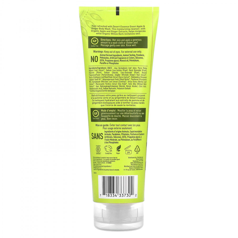 Освежитесь с помощью геля для душа с экстрактом зеленого яблока и имбиря от Desert Essence. Это увлажняющее очищающее средство с органическими экстрактами яблока и имбиря бодрит, а органическая кора ивы восстанавливает кожу.