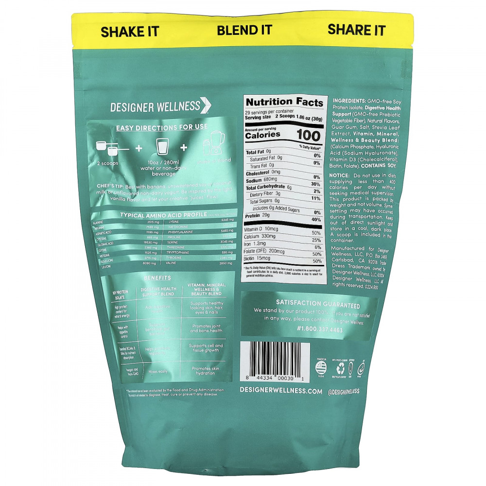 Изолят соевого белка без ГМО, поддержка здоровья пищеварительной системы (пребиотическая растительная клетчатка без ГМО), натуральные ароматизаторы, гуаровая камедь, соль, экстракт листьев стевии, витамины, минеральными, Wellness & смесь для красоты: (фосфат кальция, гиалуроновая кислота (гиалуронат натрия), витамин D3 (холекальциферол), биотин, фолат).
