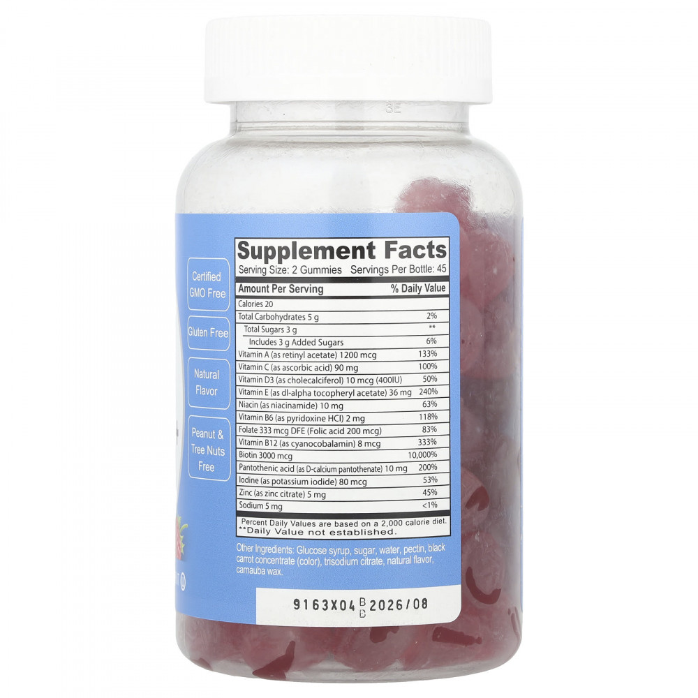 Витамины группы B для заряда энергии и биотин для поддержки здоровья волос, кожи и ногтей.