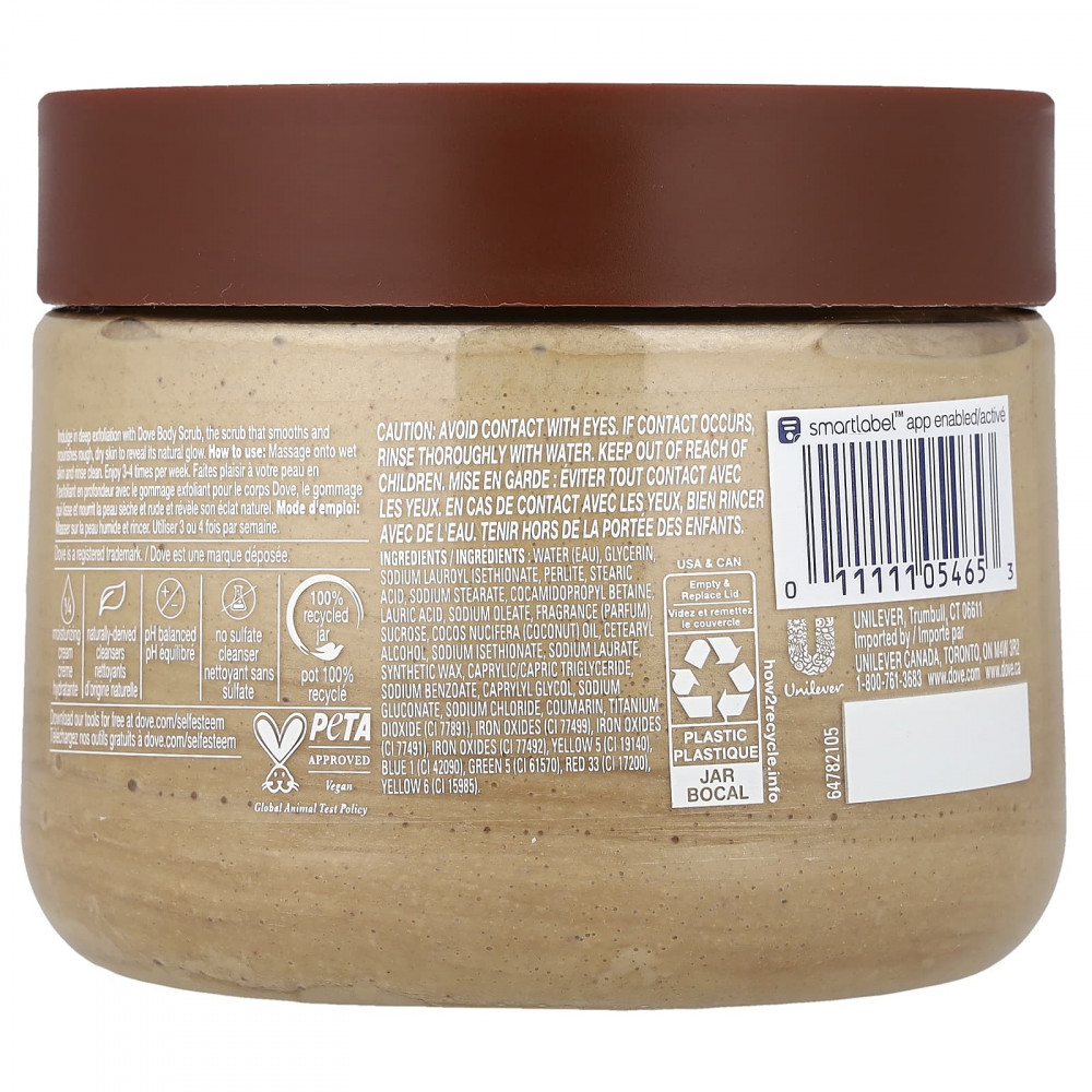 Наслаждайтесь глубоким отшелушиванием с помощью скраба для тела Dove, который разглаживает и питает огрубевшую, сухую кожу, придавая ей естественное сияние.
