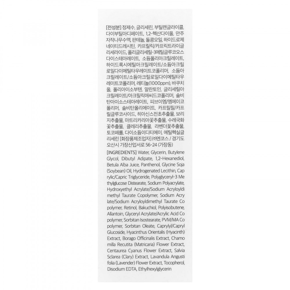 Вода, глицерин, бутиленгликоль, дибутиладипат, 1,2-гександиол, березовый сок (Betula alba), пантенол, соевое масло (Glycine soja), гидрогенизированный лецитин, каприловый/каприновый триглицерид, полиглицерил-3 метилглюкозы дистеарат, полиакрилат натрия, гидроксиэтил акрилат/натрия акрилоилдиметилтаурата сополимер, натрий акрилат/натрий акрилоилдиметилтаурат сополимер, ретинол, бакучиол, полиизобутен, аллантоин, сополимер глицерил акрилата/акриловой кислоты, сорбитан изостеарат, ПВМ/МА сополимер, сорбитанолеат, каприлил/каприл глюкозид, экстракт гиацинта (Hyacinthus orientalis), экстракт бурачника лекарственного, экстракт цветков ромашки лекарственной (Chamomilla recutita), экстракт цветков василька (Centaurea cyanus), экстракт шалфея (Salvia sclarea), экстракт цветков лаванды, токоферол, двунатриевая ЭДТК, этилгексилглицерин.