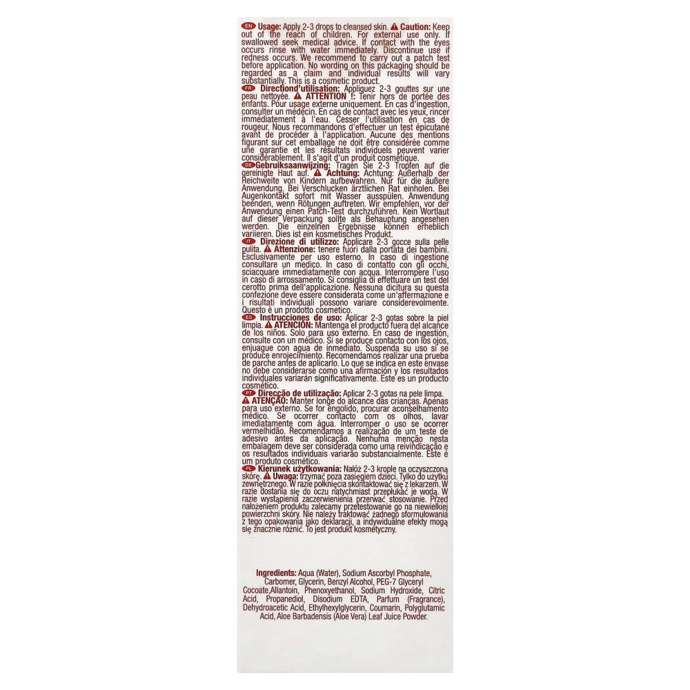 Вода (Aqua), аскорбил фосфат натрия, карбомер, глицерин, бензиловый спирт, ПЭГ-7 глицерил кокоат, аллантоин, феноксиэтанол, гидроксид натрия, лимонная кислота, пропандиол, двунатриевая ЭДТК, парфюмерная композиция (отдушка), дегидроуксусная кислота, этилгексилглицерин, кумарин, полиглутаминовая кислота, порошок из сока листьев алоэ вера (Aloe barbadensis).