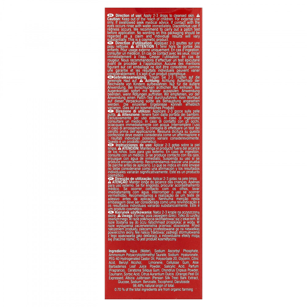 Вода (Aqua), аскорбил фосфат натрия, полиакрилоилдиметил таурат аммония, гиалуронат натрия, ПЭГ-40 гидрогенизированное касторовое масло, полисорбат 20, глицерин, лимонная кислота, бензиловый спирт, лимонен, целлюлозная камедь, порошок из сока листьев алоэ вера (Aloe barbadensis), салициловая кислота, парфюмерная композиция (отдушка), камедь рожкового дерева (Ceratonia siliqua), порошок каррагенана (Chondrus crispus), кумарин, сорбиновая кислота, масло из цедры апельсина (Citrus aurantium dulcis), экстракт коры персидского шелкового дерева (Albizia julibrissin), глюкоза, бензоат натрия, токоферол, дарутозид.