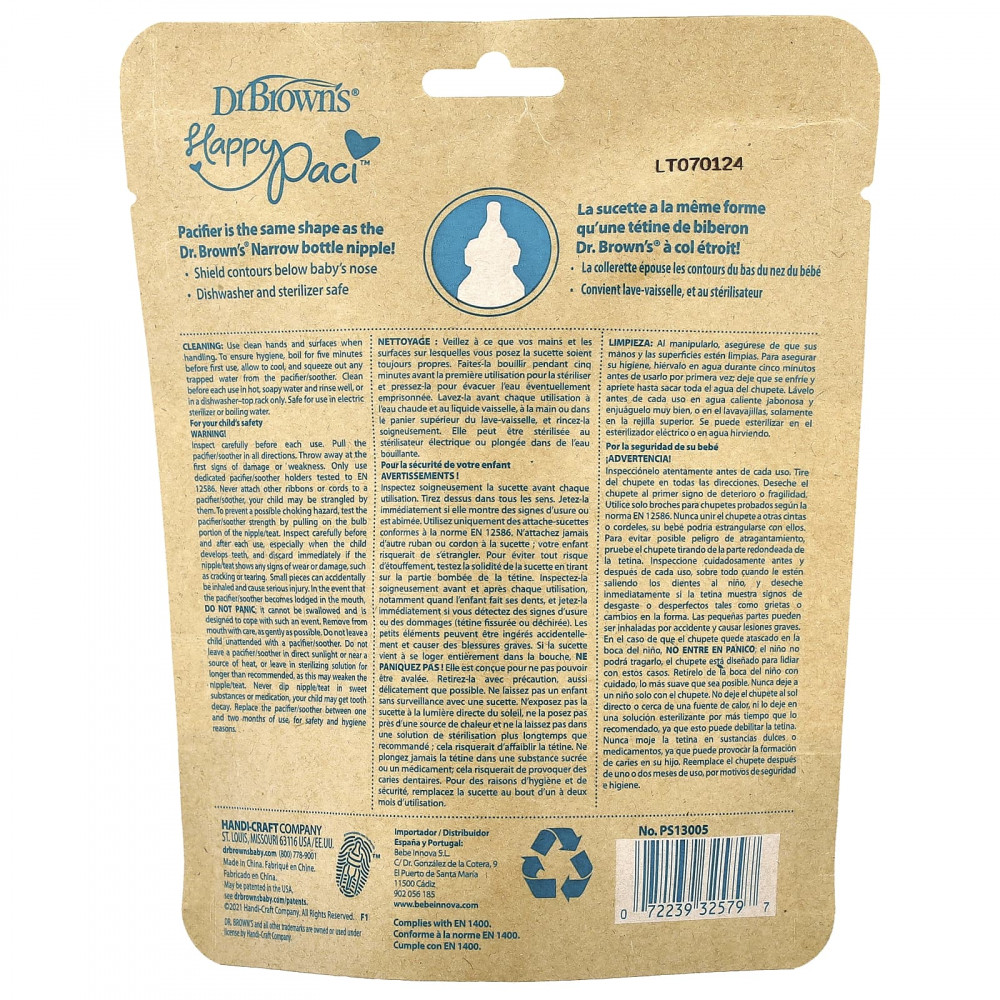 Внимательно осматривайте перед каждым использованием. Потяните пустышку во всех направлениях. Выбросьте при первых признаках повреждения или слабости. Используйте только специальные держатели для пустышек, протестированные на соответствие стандарту EN 12586. Никогда не прикрепляйте к пустышке / пустышке другие ленты или шнуры, так как они могут задушить ребенка. Во избежание опасности удушья проверьте прочность соски-пустышки, потянув за горлышко соски. Тщательно осматривайте до и после каждого использования, особенно если у ребенка развиваются зубы. Немедленно утилизируйте соску, если на соске появятся какие-либо признаки износа или повреждения, такие как растрескивание или разрыв. Небольшие кусочки продукта могут случайно вдохнуть и нанести серьезную травму. Если пустышка застрянет во рту, не паникуйте; его нельзя глотать и он предназначен для того, чтобы справляться с подобным явлением. Осторожно вынуть продукт изо рта как можно осторожнее. Не оставляйте ребенка с пустышкой / пустышкой без присмотра. Не оставляйте пустышку под прямыми солнечными лучами или рядом с источниками тепла, а также не оставляйте соску в стерилизующем растворе дольше, чем рекомендуется, поскольку это может ослабить соску. Ни в коем случае не погружайте соску в сладкие вещества или лекарства. Это может привести к разрушению зубов. Из соображений безопасности и гигиены меняйте соску-пустышку через 1–2 месяца использования.