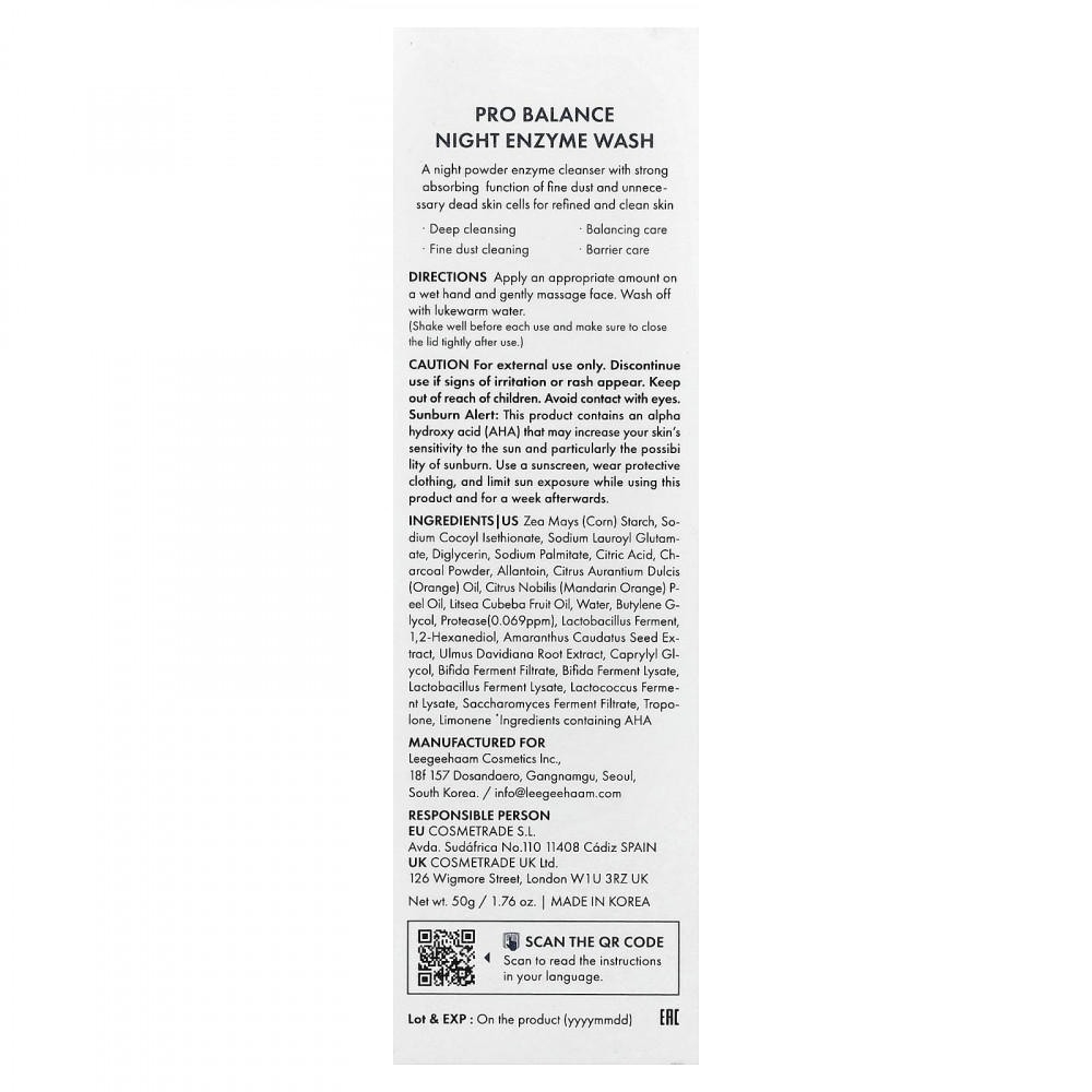 Кукурузный крахмал (Zea mays), кокоил изетионат натрия, натрия лауроил глутамат, диглицерин, пальмитат натрия, лимонная кислота, порошок из древесного угля, аллантоин, масло апельсина (Citrus aurantium dulcis), масло из цедры мандарина (Citrus nobilis), масло плодов лицеи кубебы (Litsea cubeba), вода, бутиленгликоль, протеаза (0,069 част./млн), фермент лактобактерий (Lactobacillus), 1,2-гександиол, экстракт семян амаранта хвостатого (Amaranthus caudatus), экстракт корня вяза Давида (Ulmus davidiana), каприлилгликоль, фильтрат продукта ферментации бифидобактерий, лизат ферментов бифидобактерий, лизат продукта ферментации лактобактерий, лизат ферментов лактококка, продукт ферментации дрожжевых грибков-сахаромицетов, трополон, лимонен.
