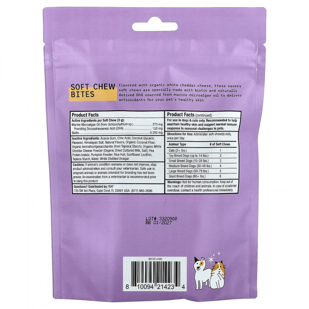 Эти пикантные мягкие жевательные таблетки, приправленные органическим белым сыром чеддер, специально изготовлены из биотина и натуральной ДГК, полученной из масла морских микроводорослей, чтобы обеспечить антиоксиданты для здоровой кожи вашего питомца.