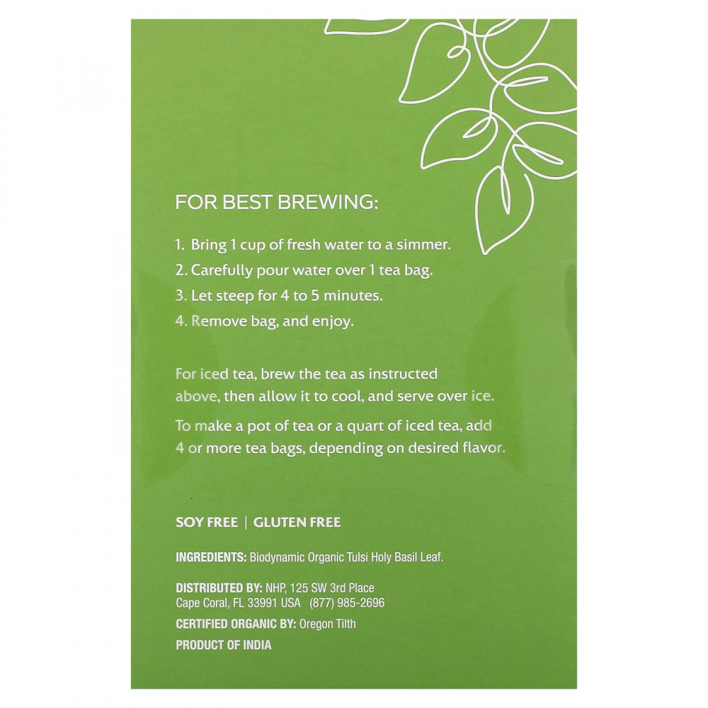 Этот травяной чай, изготовленный только из лучших листьев, содержит мягкую смесь трех сортов тулси — Кришна, Рама и Вана, которая обладает освежающим насыщенным, но мятным вкусом. Без кофеина идеально подходит в качестве успокаивающего вечернего напитка.