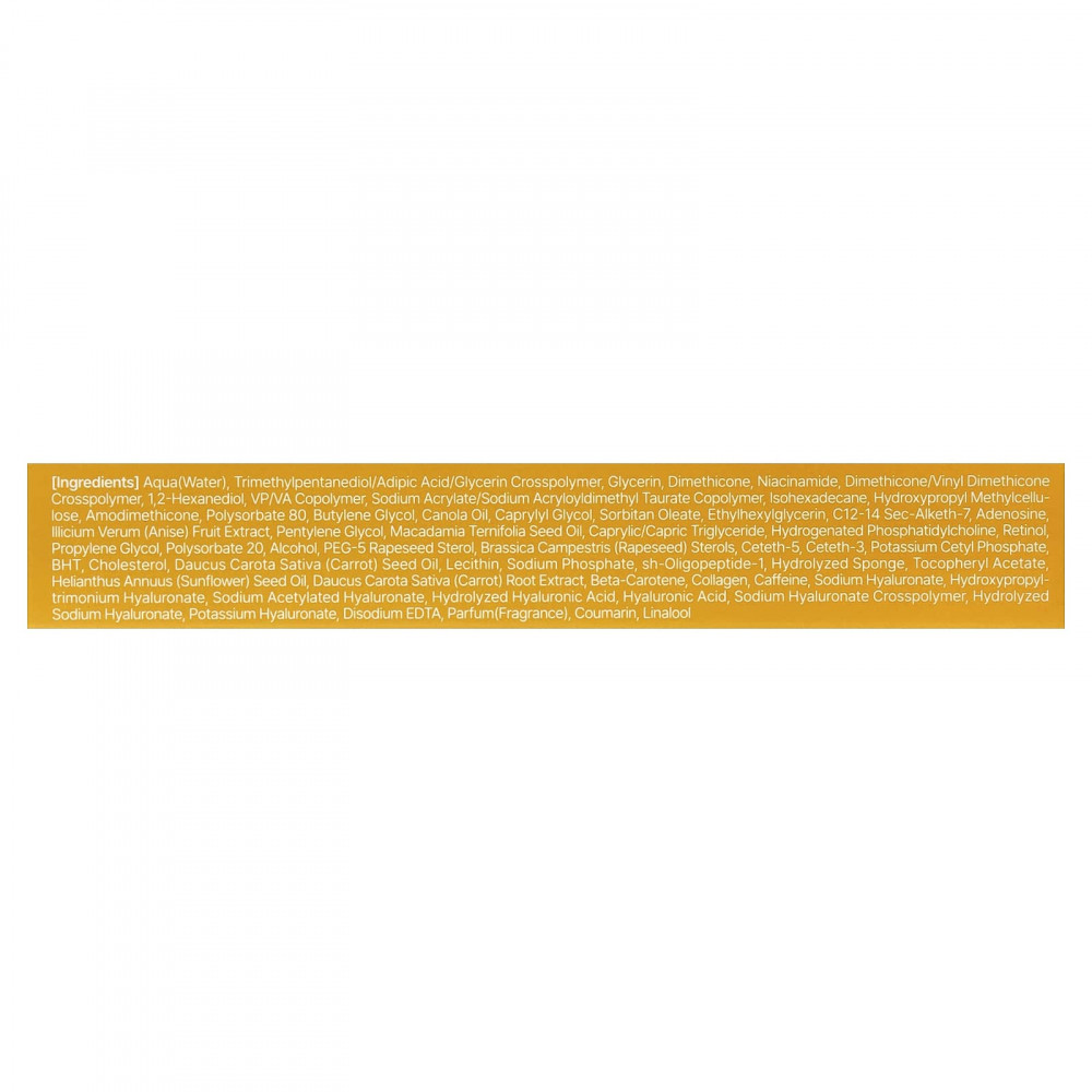 Вода, триметилпентандиол/адипиновая кислота/глицерин кроссполимер, глицерин, диметикон, никотинамид, диметикон/винил диметикон кроссполимер, 1,2-гександиол, ВП/ВА сополимер, натрий акрилат/натрий акрилоилдиметилтаурат сополимер, изогексадекан, гидроксипропилметилцеллюлоза, амодиметикон, полисорбат 80, бутиленгликоль, рапсовое масло, каприлилгликоль, сорбитанолеат, этилгексилглицерин, C12-14 втор-алкет-7, аденозин, экстракт плодов аниса звездчатого (Illicium verum), пентилен гликоль, масло макадамии (Macadamia ternifolia), каприловый/каприновый триглицерид, гидрогенизированный фосфатидилхолин, ретинол, пропиленгликоль, полисорбат 20, спирт, ПЭГ-5 стерол рапса, рапсовые стеролы (Brassica campestris), цетет-5, цетет-3, цетил фосфат калия, бутилгидрокситолуол, холестерина, масло из семян моркови (Daucus carota sativa), лецитин, фосфат натрия, sh-олигопептид-1, гидролизованная губка, токоферилацетат, подсолнечное масло (Helianthus annuus), экстракт корнеплода моркови (Daucus carota sativa), бета-каротин, коллаген, кофеин, гиалуронат натрия, гидроксипропилтримония гиалуронат, ацетилированный гиалуронат натрия, гидролизованная гиалуроновая кислота, гиалуроновая кислота, кроссполимер гиалуроната натрия, гидролизованный гиалуронат натрия, гиалуронат калия, двунатриевая ЭДТК, парфюмерная композиция (отдушка), кумарин, линалоола.