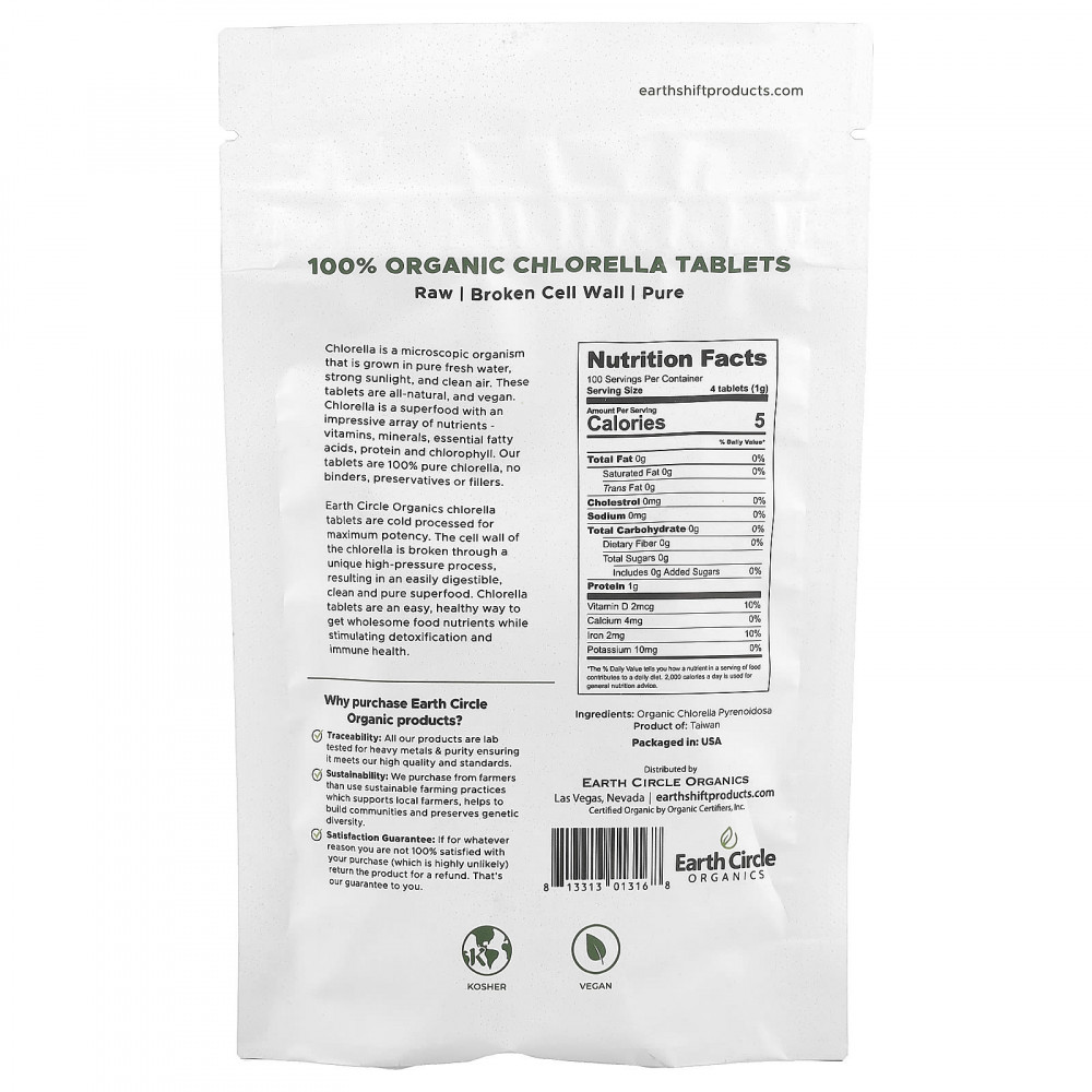 Хлорелла — это микроскопическая зеленая водоросль, обитающая в пресной воде. Название Chlorella происходит от двух латинских слов, означающих «лист» (зеленый) и «маленький», что указывает на необычно высокое содержание хлорофилла — самого высокого среди всех известных растений — что придает хлорелле характерный глубокий изумрудно-зеленый цвет. Условием ее роста является чистая пресная вода, яркий солнечный свет и незагрязненный воздух. Хлорелла — это суперпродукт, содержащий множество питательных веществ: витамины, минералы, белок и хлорофилл. Эти таблетки представляют собой органический, веганский, необработанный продукт и не содержат ГМО, связующих веществ, консервантов и наполнителей.