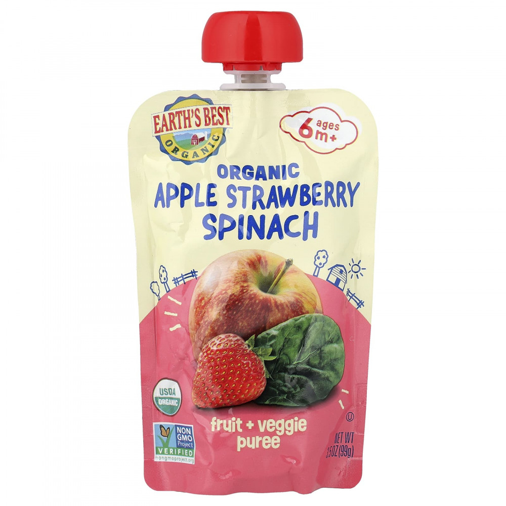 Органическое яблочное пюре, органическое клубничное пюре, органический шпинат, содержит менее 1% органических концентратов лимонного сока.