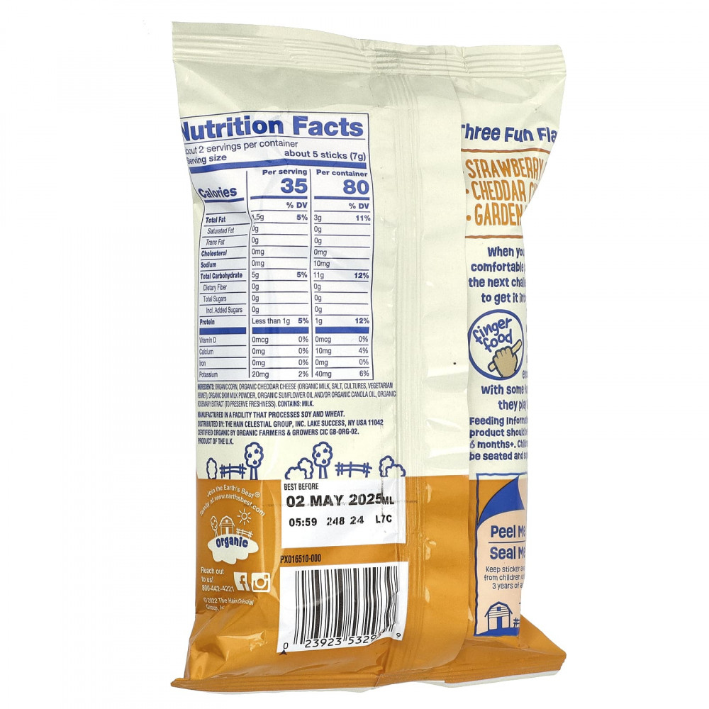 Органическая кукуруза, органический сыр чеддер (органическое молоко, соль, закваска, вегетарианский сычужный фермент), органическое сухое обезжиренное молоко, органическое подсолнечное масло и / или органическое рапсовое масло, органический экстракт розмарина (для сохранения свежести).