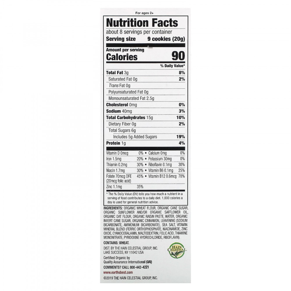 Органическая пшеничная мука, органический тростниковый сахар, органическое подсолнечное и/или органическое сафлоровое масло, органическая овсяная мука, органическая паста из изюма, вода, органический инвертный тростниковый сахар, органическая корица, разрыхлитель (бикарбонат натрия, бикарбонат аммония), морская соль, смесь витаминов и минералов (ортофосфат железа, никотинамид, оксид цинка, цианокобаламин, мальтодекстрин, фолиевая кислота, тиамина мононитрат, пиридоксина гидрохлорид, рибофлавин).