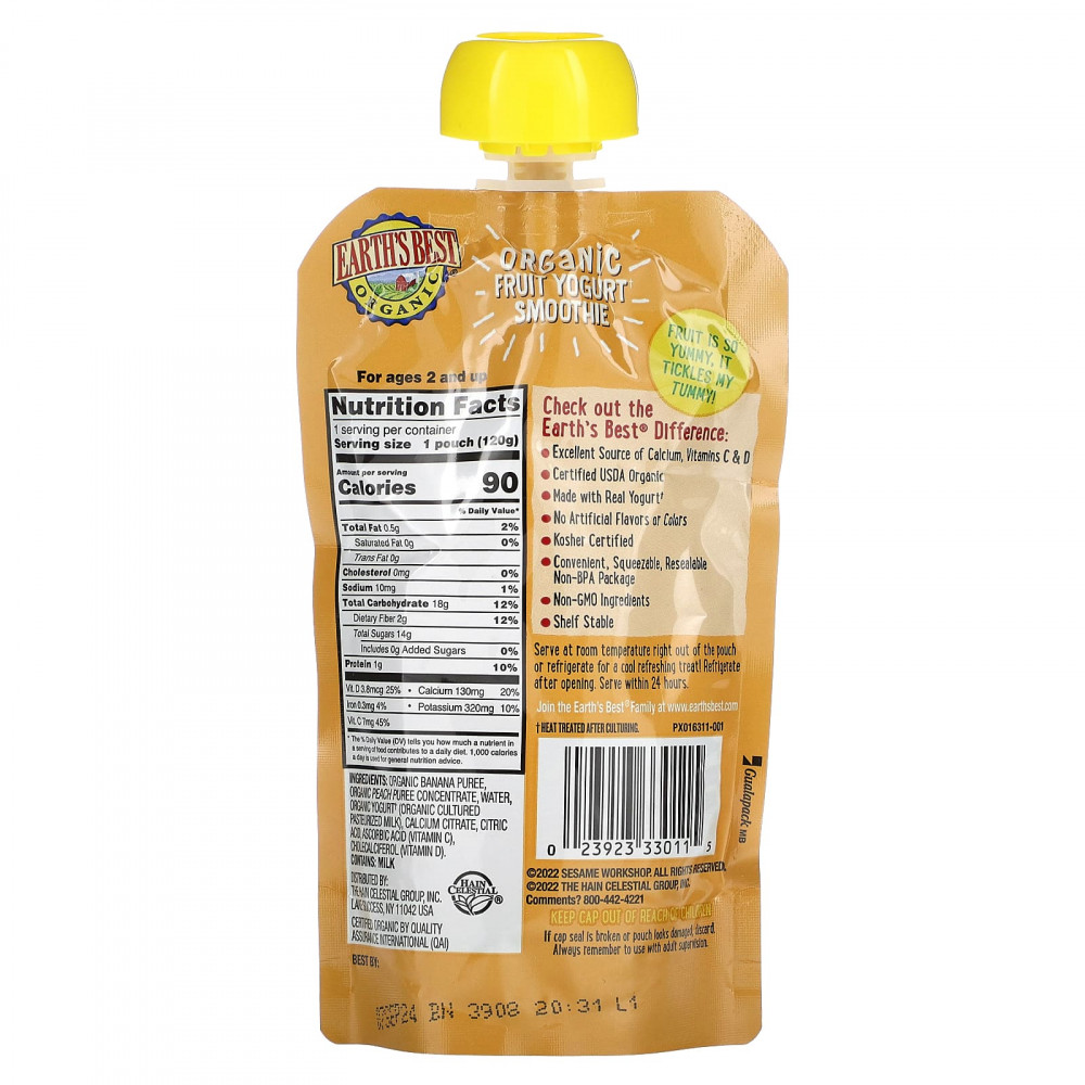 Пюре из органического банана, концентрат пюре из органического персика, вода, органический йогурт† (органическое кисло-пастеризованное молоко), цитрат кальция, лимонная кислота, аскорбиновая кислота (витамин C), холекальциферол (витамин D).