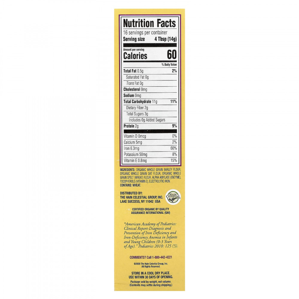 Органическая цельнозерновая ячменная мука, органическая цельнозерновая овсяная мука, органическая цельнозерновая мука из спельты (пшеничная), альфа-амилаза (фермент), токоферолы (витамин Е), электролитное железо.