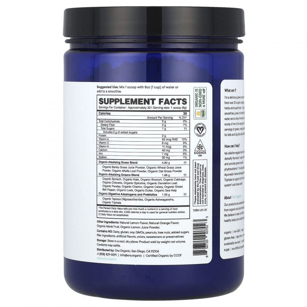 Это восхитительный порошок из зелени, содержащий более 20 органических овощей, трав, растений и суперфудов. Он отлично сочетается со смузи, соками или просто с ледяной водой и долькой лимона! Всего одна мерная ложка порошка эквивалентна 3 порциям зелени, поэтому он идеально подходит как для детей, так и для взрослых.