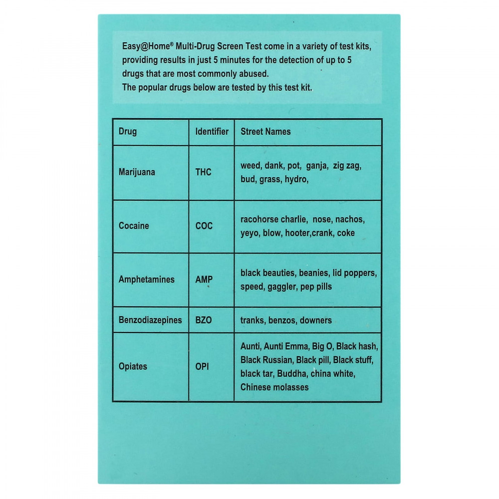 Для скринингового теста на несколько препаратов Easy @ Home доступны различные наборы, позволяющие выявлять до 5 наркотиков, которыми злоупотребляют чаще всего, всего за 5 минут. С помощью этого набора тестируются перечисленные ниже популярные препараты.