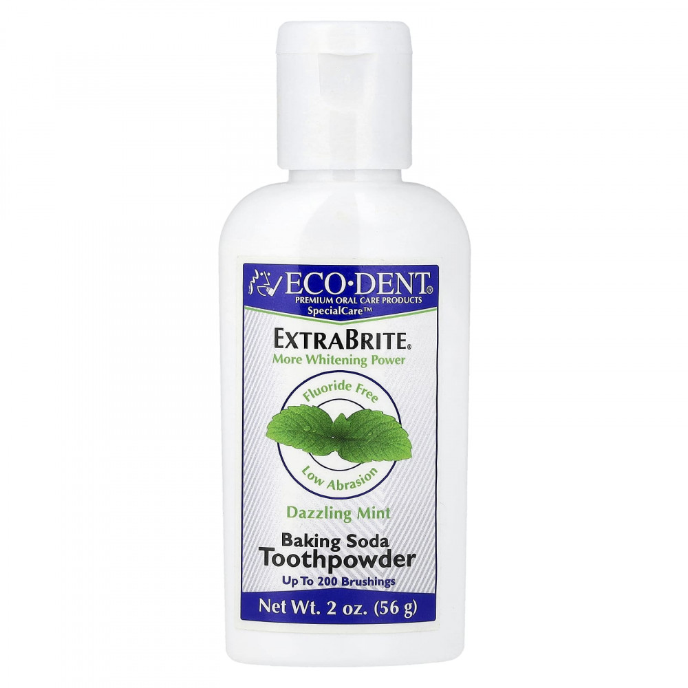 Зубные порошки SpecialCare ExtraBrite - ECO DENT ПРЕМИУМНЫЕ ПРОДУКТЫ Специального ухода за полостью рта SpecialCare EXTRABRITE Улучшенный отбеливающий эффект Без фторида Зубной порошок с пищевой содой с низким уровнем истирания с ослепительной мятой До 200 чисток