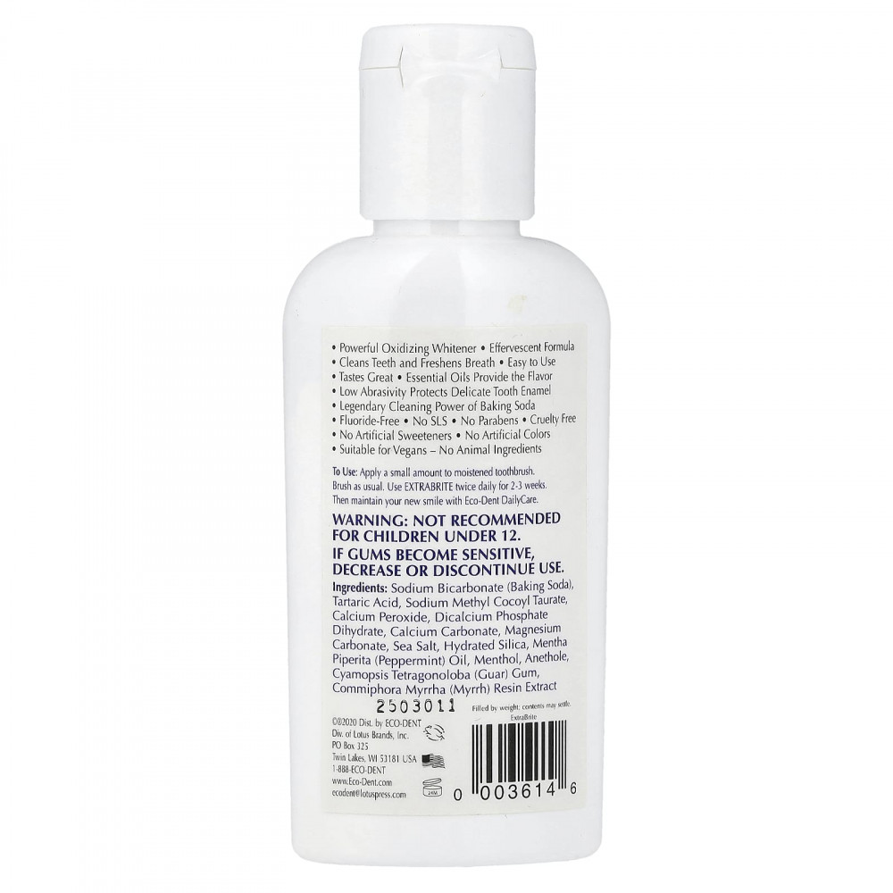 Нанесите небольшое количество на зубную щетку, предварительно смочив ее водой. Почистите зубы как обычно. Используйте ExtraBrite два раза в день в течение 2–3 недель. Поддерживайте вашу новую улыбку с помощью Eco-Dent DailyCare.