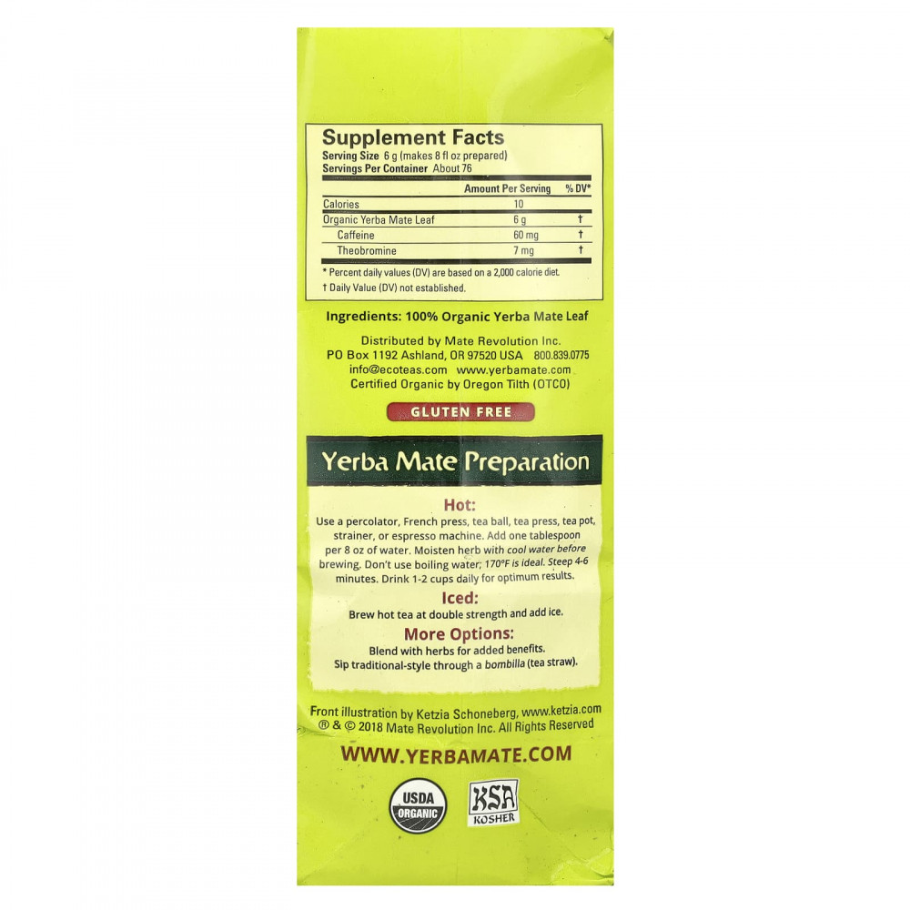 Чай мате йерба заваривают из листьев падуба, произрастающего в тропических лесах Южной Америки. Чай мате из EcoTeas сушат теплым воздухом, а не дымом, для получения чистого и мягкого вкуса.