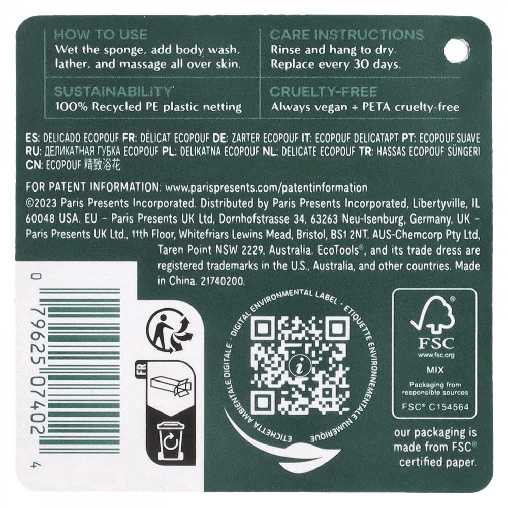 Люфа для ванны EcoTools от EcoTools разработана с использованием сверхмягкой переработанной сетки для бережной очистки всего тела. Используйте деликатную люфу для тела от EcoTools для нежного отшелушивания кожи в душе или ванне. Веганский пуф для ванны изготовлен из переработанной сетки.