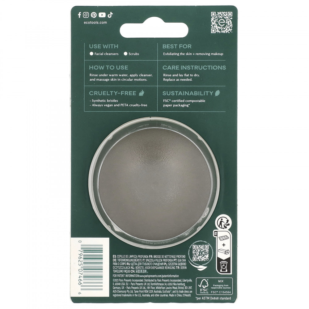 Щеточка для глубокого очищения имеет протестированные дерматологами щетинки, созданные с соблюдением принципов этики, для глубокого очищения пор и отшелушивания.
