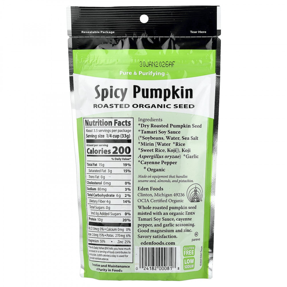 Отборные семена тыквы с добавлением органического кайенского перца, органического чеснока и органического соевого соуса Тамари от Eden. Жаркий, пряный, пикантный вкус. Прекрасный источник белка и полезных питательных веществ. Женщины любят магний. Мужчины предпочитают цинк. И те и другие непременно оценят этот снек с низким содержанием натрия и без примесей.