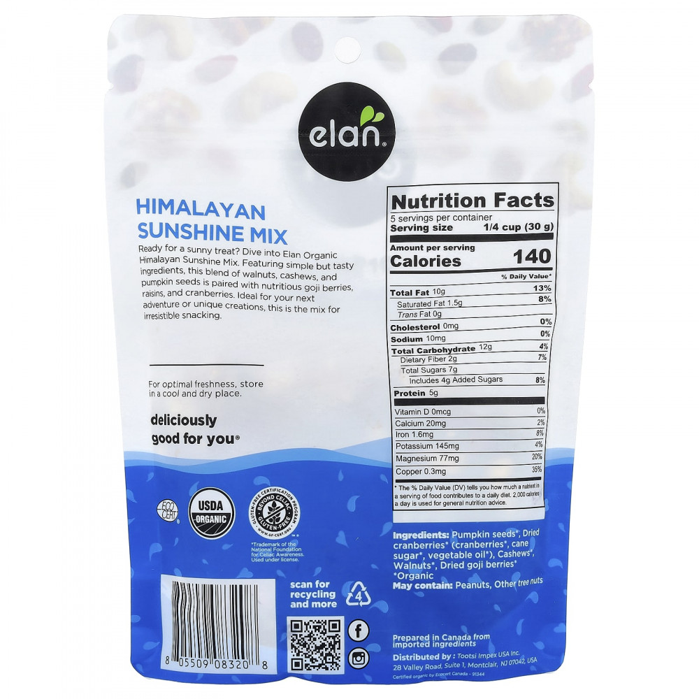 Готовы к солнечному лакомству? Попробуйте органическую смесь Himalayan Sunshine от Elan. Эта смесь грецких орехов, кешью и тыквенных семечек сочетается с простыми, но вкусными ингредиентами, а также питательными ягодами годжи, изюмом и клюквой. Эта смесь идеально подходит для вашего следующего приключения или уникального творения. Это смесь для неотразимого снека.