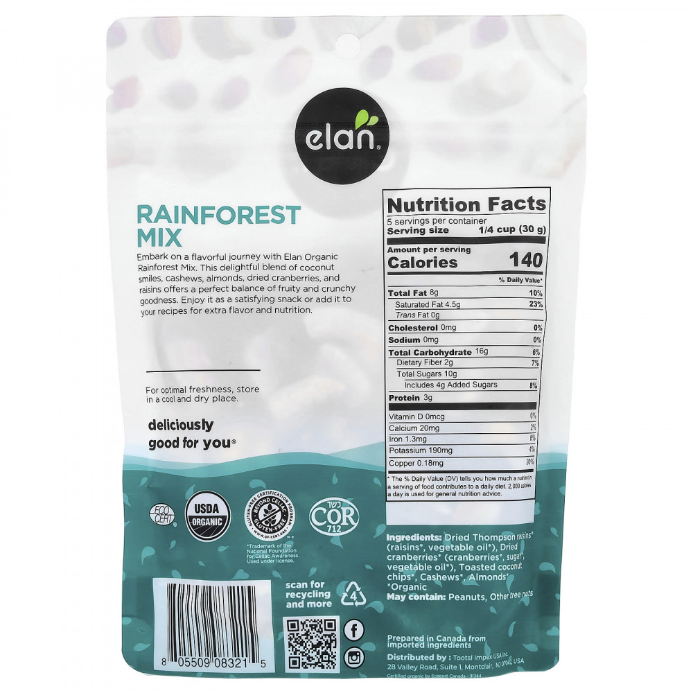 Попробуйте органическую смесь Rainforest от Elan, чтобы насладиться ароматом. Эта восхитительная смесь кокосовой пальмы, кешью, миндаля, сушеной клюквы и изюма предлагает идеальный баланс фруктовых и хрустящих ингредиентов. Ешьте в качестве снека или добавляйте в свои блюда для придания им дополнительного вкуса и питательных веществ.