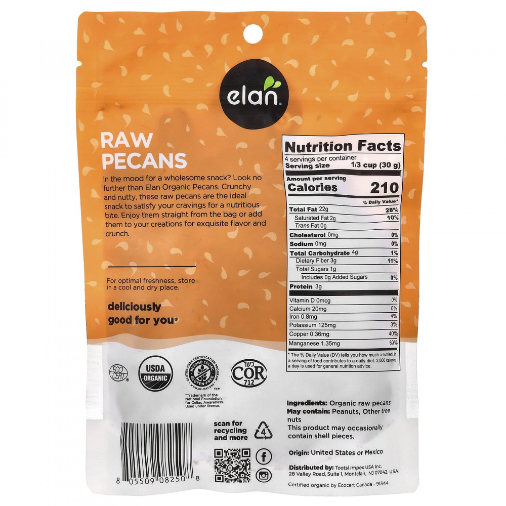 Хотите полезного снека? Подходит для вас — органический пекан от Elan. Хрустящий и ореховый, этот сырой пекан является идеальным снеком, который утоляет голод по питательным веществам. Ешьте их прямо из упаковки или добавьте в свои творения для получения изысканного вкуса и хрустящей корочки.