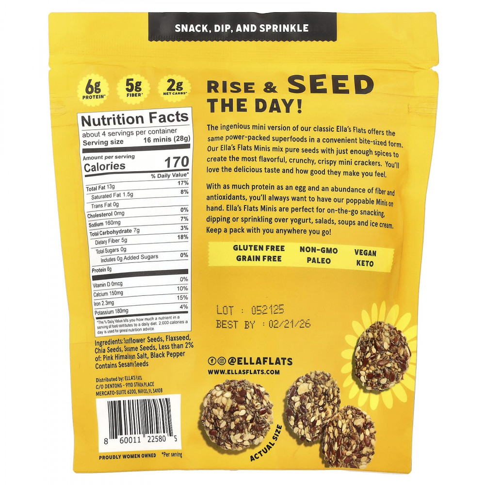 Оригинальная мини-вариация наших классических батончиков Ella's Flats содержит те же эффективные суперфуды в удобной форме небольшого размера. В наших жевательных мармеладках Ella's Flats смешаны чистые семена с достаточным количеством специй, чтобы получить самые ароматные, хрустящие и хрустящие мини-крекеры. Вам понравится их восхитительный вкус и хорошее самочувствие. Благодаря содержанию белка в яйце, а также клетчатки и антиоксидантов, наши мини-печенья всегда будут под рукой.