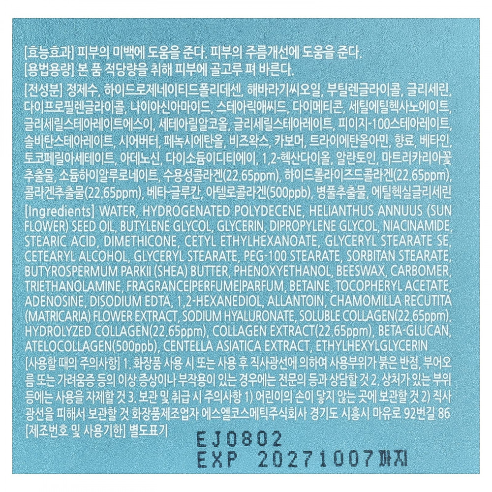 Вода, гидрогенизированный полидецен, масло семян подсолнечника (Helianthus annuus), бутиленгликоль, глицерин, дипропиленгликоль, никотинамид стеариновая кислота, диметикон, цетилэтилгексаноат, глицерил стеарат эмульгирующий цетеариловый спирт, глицерил стеарат, ПЭГ-100 стеарат, сорбитан стеарат (Butyrospermum parkii) масло ши, феноксиэтанол, пчелиный воск, карбомер триэтаноламин, отдушка|отдушка|парфюмерная композиция, бетаин, токоферилацетат аденозин, двунатриевая ЭДТК, 1,2-гександиол, аллантоин, экстракт цветков ромашки лекарственной (Chamomilla recutita), гиалуронат натрия, растворимый коллаген (22,65 част./млн), гидролизованный коллаген (22,65 част./млн), экстракт коллагена (22,65 част./млн), бета-глюкан и ателоколлаген (500 част./млрд), экстракт готу колы (Centella asiatica), этилгексилглицерин.