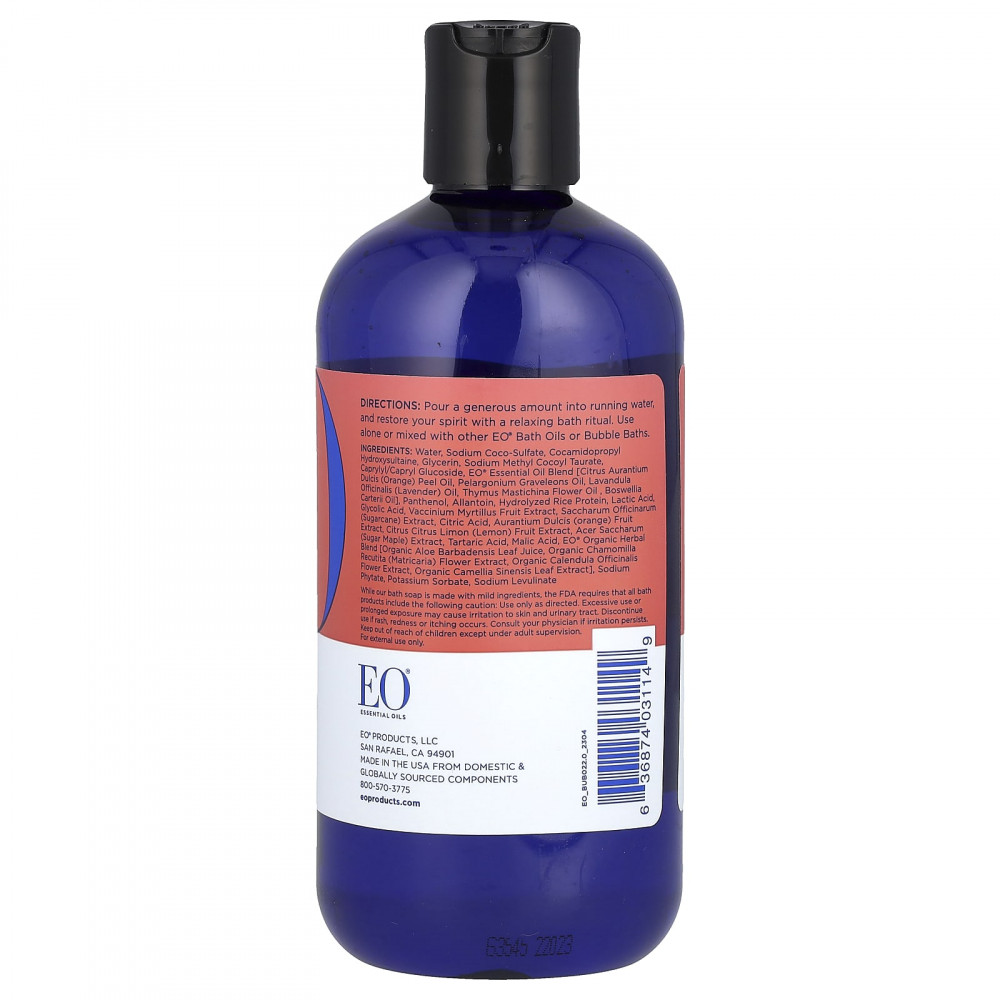 Вода, кокосульфат натрия, кокамидопропил гидроксисултаин, глицерин, натрия метил кокоил таурат, каприлил/каприл глюкозид, смесь эфирных масел eo® [масло из цедры апельсина (Citrus aurantium dulcis), масло пеларгонии (Pelargonium graveleons), масло лаванды (Lavandula officinalis), масло из цветков вилочковой железы (Thymus mastichina) , масло босвеллии (Boswellia carterii), пантенол, аллантоин, гидролизованный рисовый протеин, молочная кислота, гликолевая кислота, экстракт ягод черники (Vaccinium myrtillus), экстракт сахарного тростника (Saccharum officinarum), лимонная кислота, экстракт плодов апельсина (aurantium dulcis), экстракт плодов лимона (Citrus citrus limon), экстракт сахарного клена (Acer saccharum), винная кислота, яблочная кислота, органическая травяная смесь eo® [сок листьев органического алоэ вера, органический экстракт цветков ромашки (Chamomilla recutita), органический экстракт цветков календулы (Calendula officinalis), органический экстракт листьев зеленого чая (Camellia sinensis)], фитат натрия, сорбат калия, левулинат натрия.