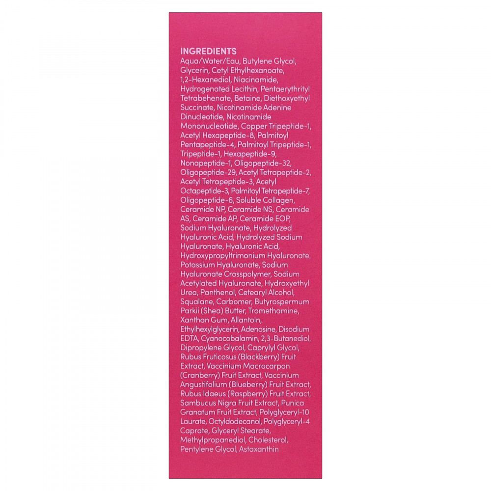 Вода, бутиленгликоль, глицерин, цетилэтилгексаноат, 1,2-гександиол, никотинамид, гидрогенизированный лецитин, пентаэритритил тетрабегенат, бетаин, диэтоксиэтил сукцинат, никотинамид аденин динуклеотид, никотинамид мононуклеотид, меди трипептид-1, ацетил гексапептид-8, пальмитоил пентапептид-4, пальмитоил трипептид-1, трипептид-1, гексапептид-9, нонапептид-1, олигопептид-32, олигопептид-29, ацетил тетрапептид-2, ацетил тетрапептид-3, ацетил октапептид-3, пальмитоил тетрапептид-7, олигопептид-6, растворимый коллаген, керамид NP, керамид NS, керамид AS, керамид АP, керамид EOP, гиалуронат натрия, гидролизованная гиалуроновая кислота, гидролизованный гиалуронат натрия, гиалуроновая кислота, гиалуронат гидроксипропилтримония, гиалуронат калия, кроссполимер гиалуроната натрия, ацетилированный гиалуронат натрия, гидроксиэтилированная мочевина, пантенол, цетеариловый спирт, сквалан, карбомер, масло ши (Butyrospermum parkii), трометамин, ксантановая камедь, аллантоин, этилгексилглицерин, аденозин, двунатриевая ЭДТК, цианокобаламин, 2,3-бутандиол, дипропиленгликоль, каприлилгликоль, экстракт ягод ежевики (Rubus fructicosus), экстракт ягод клюквы (Vaccinium macrocarpon), экстракт ягод голубики (Vaccinium angustifolium), экстракт ягод малины (Rubus idaeus), экстракт плодов черной бузины (Sambucus nigra), экстракт плодов граната (Punica granatum), полиглицерил-10 лаурат, октилдодеканол, полиглицерил-4 капрат, глицерил стеарат, метилпропандиол, холестерина, пентилен гликоль, астаксантин.