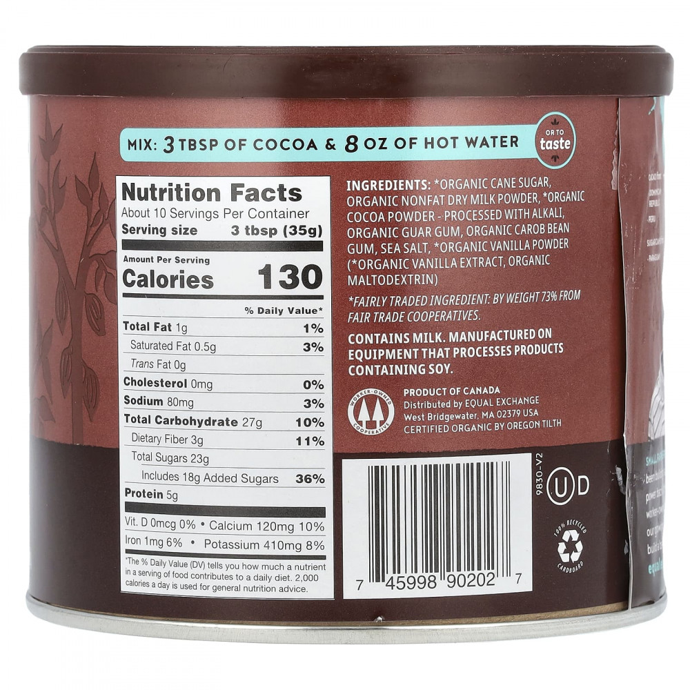 Это насыщенное шоколадное горячее какао изготовлено из органического какао, выращенного фермерскими кооперативами в Доминиканской республике и Перу, органического тростникового сахара от мелких фермеров в Парагвае и органического сухого молока. Это популярное лакомство, которое легко готовить и которое легко любить.