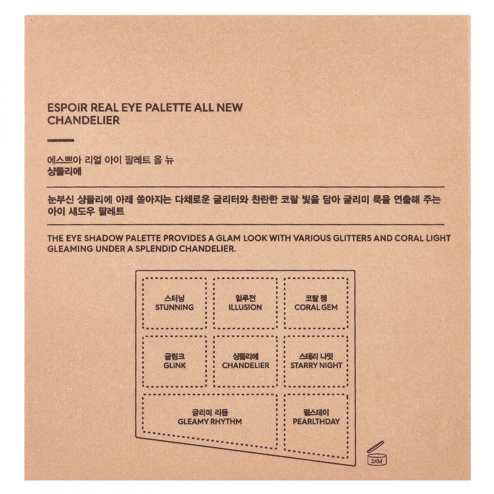 Палитра теней для век обеспечивает гламурный вид с различными блестками и коралловым сиянием под великолепной люстрой.