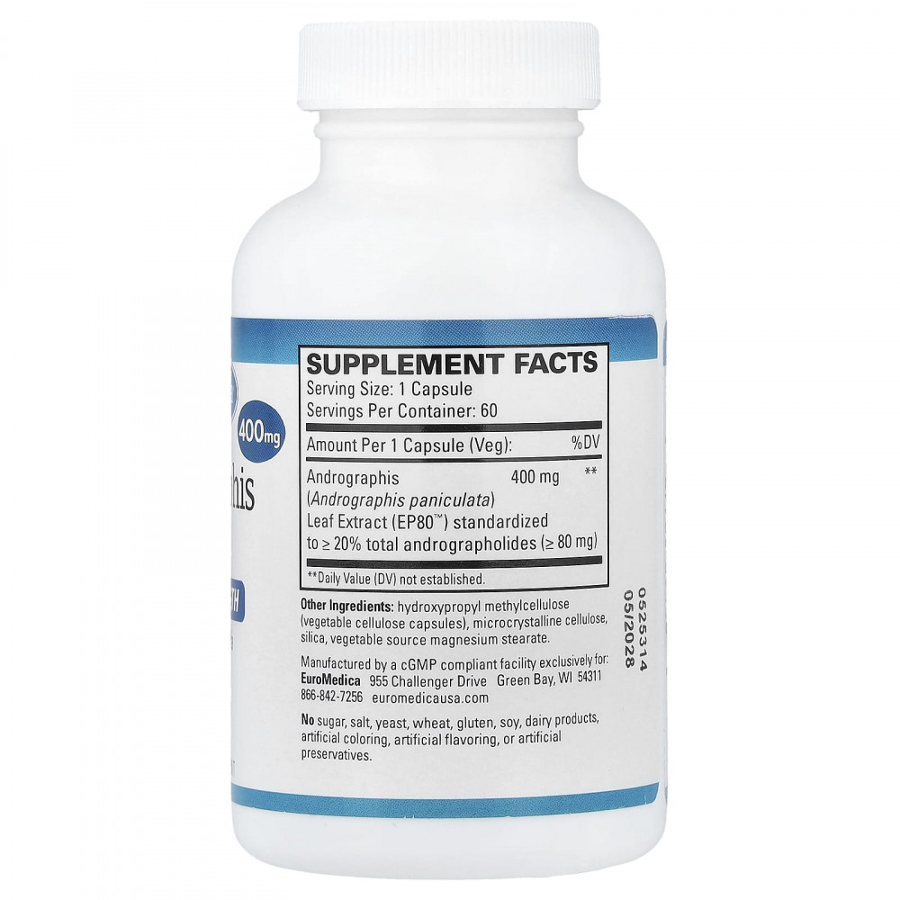 | Экстракт листьев андрографиса (Andrographis paniculata) (EP80™), стандартизированный до содержания ≥ 20% андрографолидов (≥ 80 мг) | 400 мг | ** |