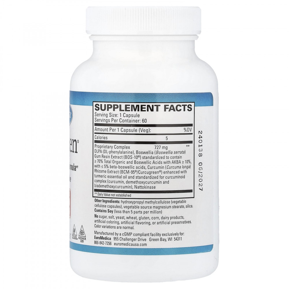 | Запатентованный комплекс DL-фенилаланин, экстракт смолы камеди босвеллии (Boswellia serrata) (BOS-10®), стандартизованный до содержания ≥ 70% органических и босвеллиевых кислот, при этом AKBA — ≥ 10%, с ≤ 5% бета-босвеллиевых кислот, куркумин (Curcuma longa) экстракт корневища (BCM-95®/Curcugreen®), обогащенный эфирным маслом куркумы и стандартизированный до содержания куркуминоидного комплекса (куркумина, диметоксикуркумина и бисдеметоксикуркумина), наттокиназы | 727 мг | ** |