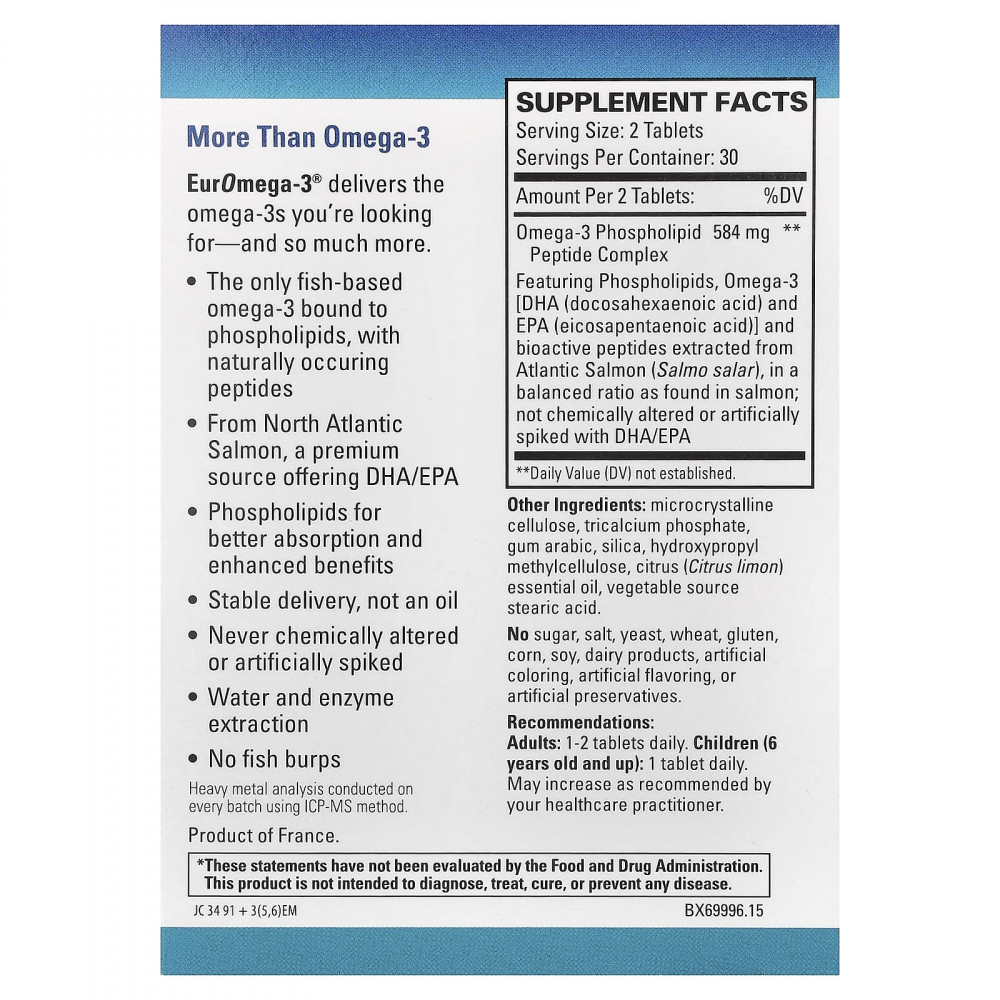 Выберите EurOmega-3®, потому что он предлагает больше, чем просто рыбий жир или криль. EurOmega-3 содержит омега-3 ДГК/ЭПК, а также фосфолипиды и активные пептиды для более здоровых результатов!