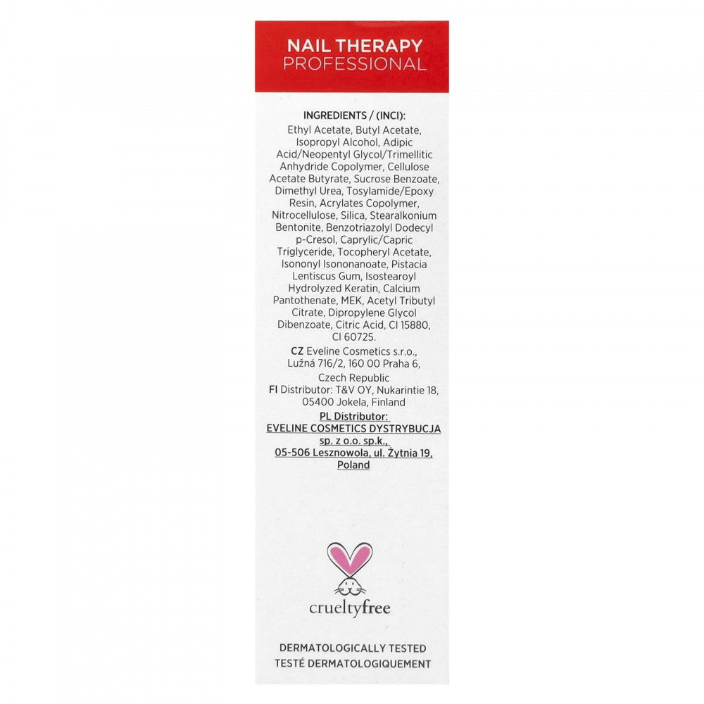 Этилацетат, бутилацетат, изопропиловый спирт, сополимер адипиновой кислоты / неопентилгликоля / тримеллитового ангидрида, бутират ацетата целлюлозы, бензоат сахарозы, диметилмочевина, тосиламид/эпоксидная смола, сополимер акрилатов, нитроцеллюлоза, диоксид кремния, стеаралкония бентонит, бензотриазолил додецил п-крезол, каприловый/каприновый триглицерид, токоферилацетат, изононил изононаноат, камедь фисташки (Fistacia lentiscus), изостеароил гидролизованный кератин, пантотенат кальция, Mek, ацетил трибутил цитрат, дипропиленгликоль дибензоат, лимонная кислота, CI 15880, CI 60725.