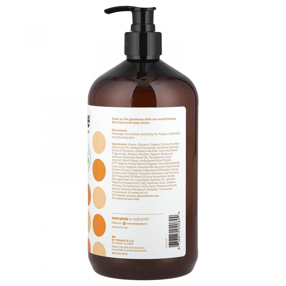 Вода, глицерин, органическое кокосовое масло (cocos nucifera), глицерил стеарат, каприловый/каприновый триглицерид, цетеарил глюкозид, сорбитан оливат, стеариловый спирт, органическое масло семян кунжута (Sesamum indicum), токоферол, лецитин, цетиловый спирт, цетиловые эфиры, гидролизованный рисовый протеин, EO® смесь органических трав [сок листьев органического алоэ вера (Aloe barbadensis), органический экстракт цветков ромашки (Chamomilla recutita), органический экстракт цветков календулы (calendula officinalis), органическийэкстракт листьев зеленого чая (camellia sinensis)], EO®смесь эфирных масел [масло из цедры апельсина (Citrus aurantium dulcis), лавандовое масло (Lavandula hybrida), масло перечной мяты (Mentha piperita)], ксантановая камедь, фитат натрия, диметикон, лимонная кислота, феноксиэтанол, бензиловый спирт, сорбат калия, лимонен*.