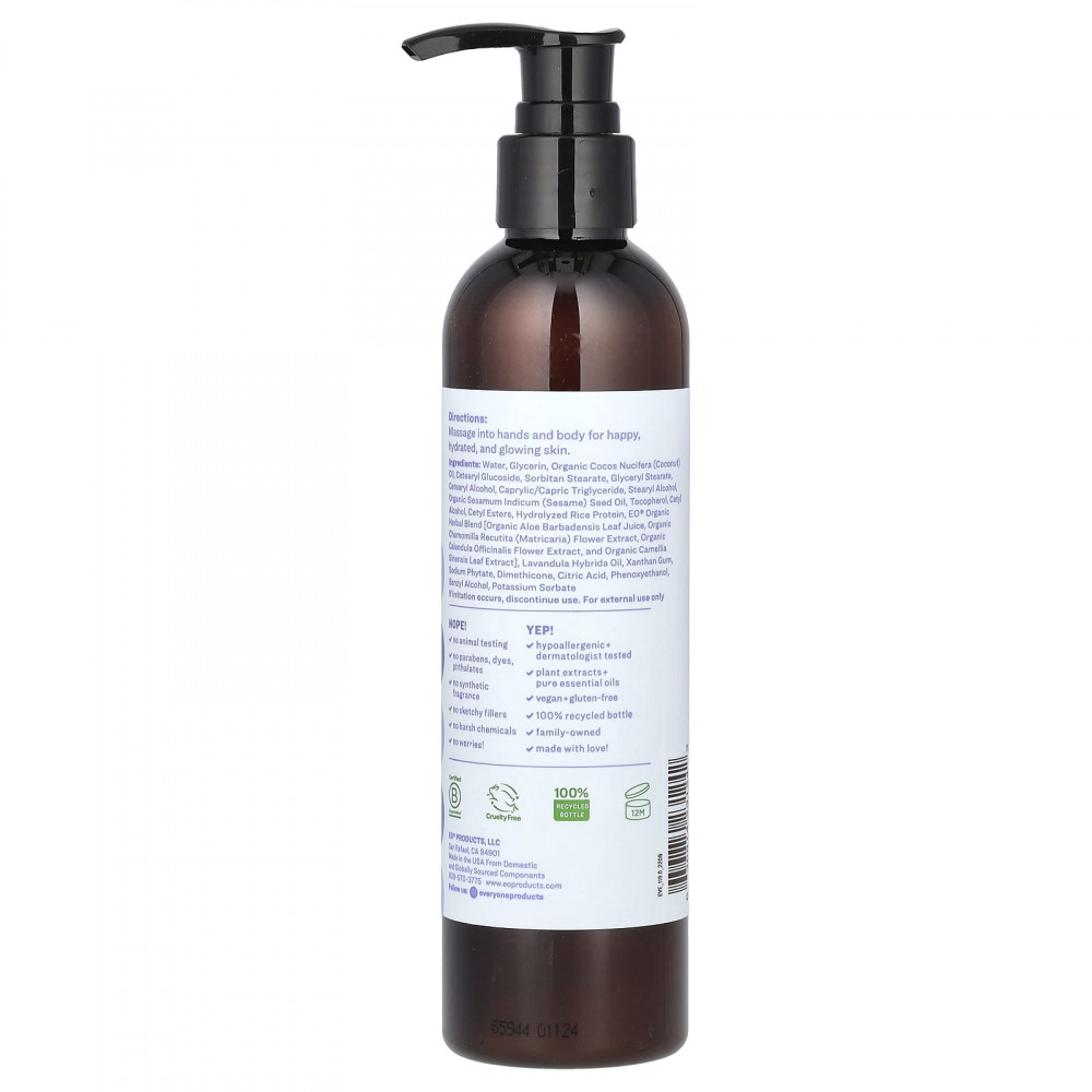 Вода, глицерин, органическое кокосовое масло (Cocos nucifera), цетеарил глюкозид, сорбитан стеарат, глицерил стеарат, цетеариловый спирт, каприловый / каприновый триглицерид, стеариловый спирт, органическое кунжутное масло (Sesamum indicum), токоферол, цетиловый спирт, цетиловые эфиры, гидролизованный рисовый белок, органическая травяная смесь eo® [сок листьев органического алоэ вера, органический экстракт цветков ромашки (Chamomilla recutita), органический экстракт цветков календулы лекарственной, органический экстракт листьев камелии китайской], масло лаванды гибридной, ксантановая камедь, фитат натрия, диметикон, лимонная кислота, феноксиэтанол, бензиловый спирт, сорбат калия.