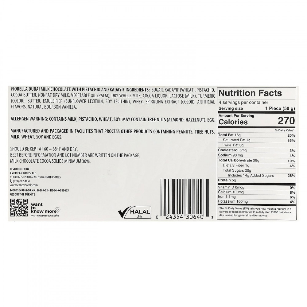 Шоколад Fiorella Дубай — это идеальное сочетание нежного молочного шоколада, хрустящей корочки катаифи и насыщенного фисташкового крема. Каждый кусочек обеспечивает восхитительный хруст, сбалансированный сливочный, ореховый вкус, и тает во рту. Эти роскошные шоколадные конфеты вы просто не сможете пропустить.