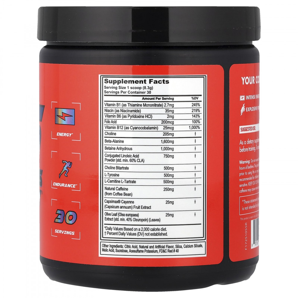 Не следует превышать рекомендуемую суточную дозу. Не употребляйте более 1 порции в день или в течение четырех часов перед сном. Этот продукт не следует использовать в качестве замены разнообразного питания или здорового образа жизни. Проконсультируйтесь с врачом перед использованием этой или любой добавки, а также при наличии каких-либо заболеваний. Высокое содержание кофеина (250 мг). Не рекомендуется детям, беременным и кормящим женщинам. Не принимайте препарат, если вы чувствительны к кофеину, ниацину или бета-аланину. Хранить в недоступном для детей месте, не предназначено для лиц младше 18 лет. Чрезмерное употребление кофеина может вызвать нервозность, бессонницу и иногда учащенное сердцебиение. Хранить в сухом и прохладном месте.