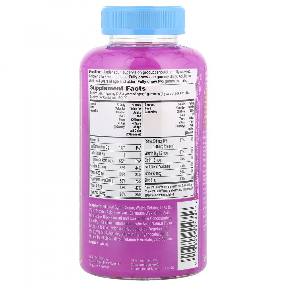 Крахмальная патока, сахар, вода, желатин; меньше 2% аскорбиновой кислоты, пчелиный воск, карнаубский воск, лимонная кислота, краситель (яблоко, концентрат сока черной смородины и моркови), d-биотин, d-пантотенат кальция, фолиевая кислота, натуральный ароматизатор, йодид калия, пиридоксина гидрохлорид, растительное масло (пальмовое), ацетат витамина A, витамин B12 (цианокобаламин), витамин D3 (холекальциферол), ацетат витамина E, сульфат цинка.